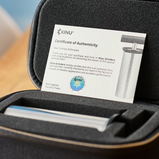 Toate râșnițele Kinu Saturn sunt ambalate într-o geantă de călătorie EVA, unde veți găsi și manualul de instrucțiuni și un certificat de autenticitate Kinu.